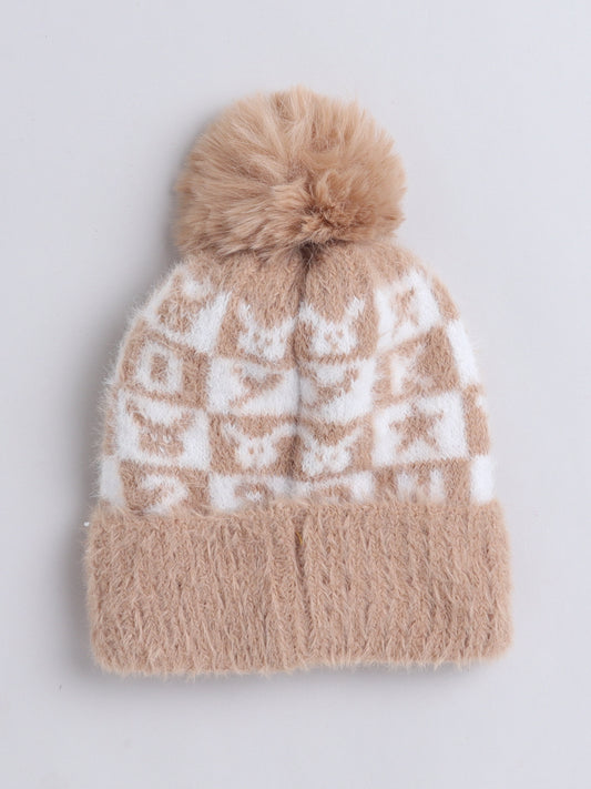 Kids Woolen Cute Alphabet Design Cap With Pom Pom - Brown