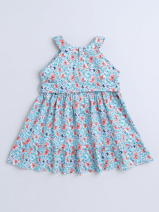 Singlet Floral Printed Cotton Sustainable Sleeveless Strappy Tiered Dress-Turquoise