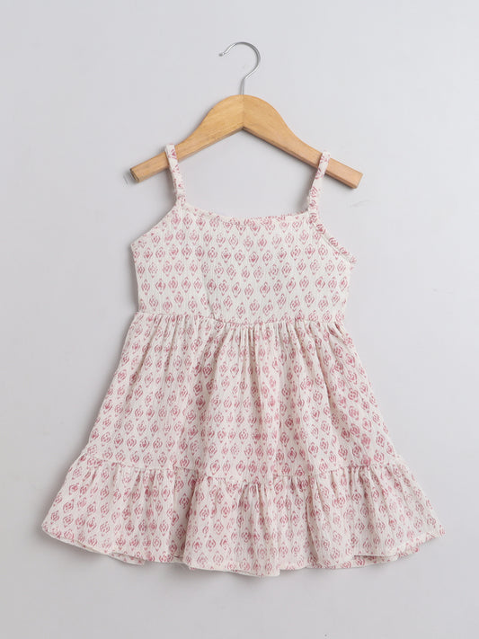 Block printed Singlet Neck sustainable Cotton Dress for Girls - Off White