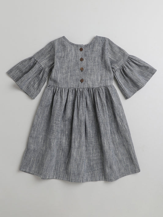 Solid Short Frill Sleeves Emboriered Bow Detailing Dress For Girls- Grey