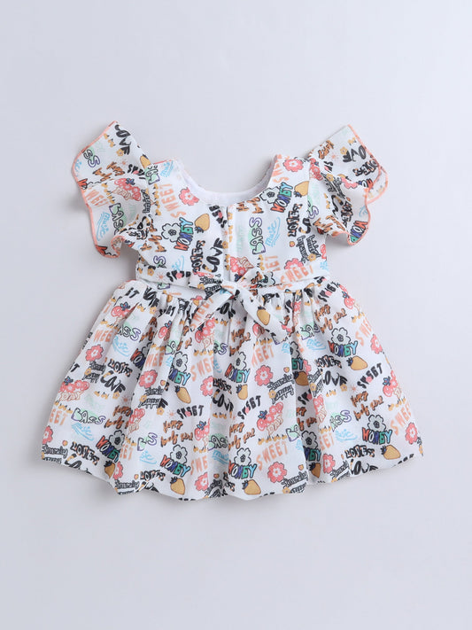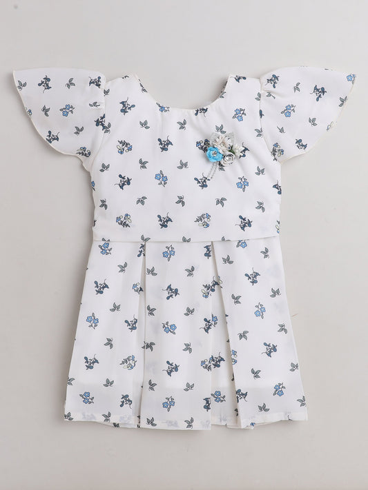 The Magic Wand Half Sleeves Floral Printed Collar Neck Dress With Belt Detailed For Girls Off White