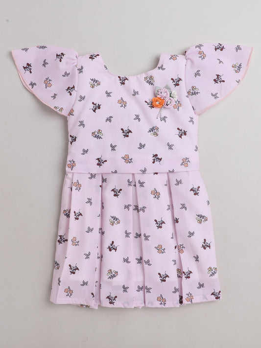 The Magic Wand Half Sleeves Floral Printed Collar Neck Dress With Belt Detailed For Girls - Pink