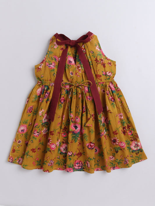 The Magic Wand Cotton Floral Incut with Neckbelt Sleeveless Dress-Mustard