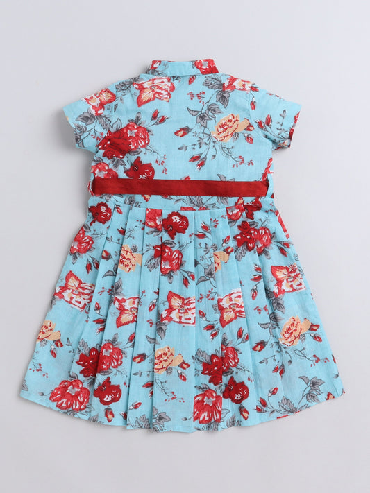 Half Sleeves Floral Printed Collar Neck Dress With Belt Detailed -Blue