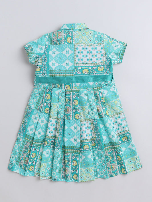 Half Sleeves Floral Printed Collar Neck Dress With Belt Detailed - Turquoise