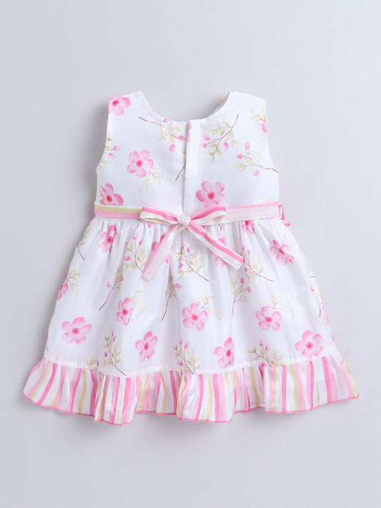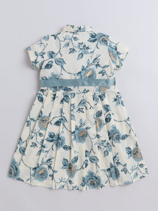 The Magic Wand Half Sleeves Floral Printed Collar Neck Dress With Belt Detailed For Girls Off White