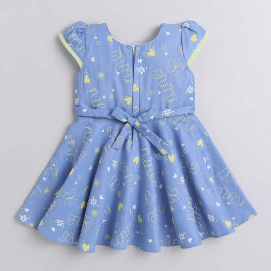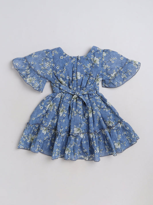 The Magic Wand Floral Printed Cap Sleeves Dress For Girls With Contrast Bow Blue