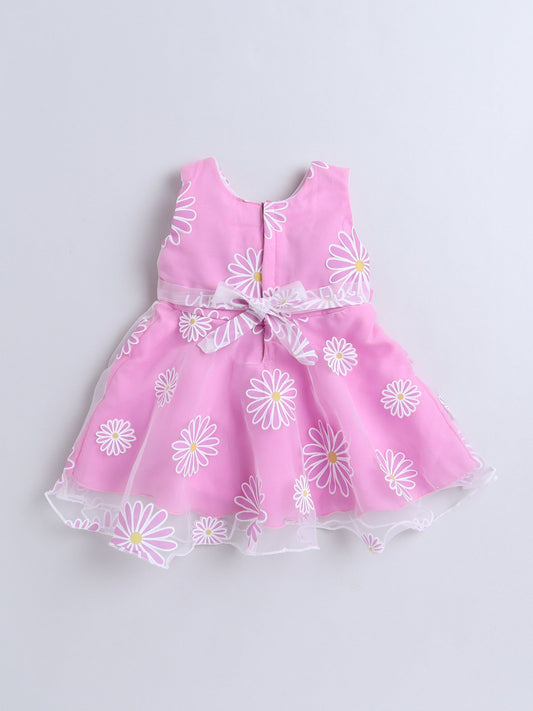 Half Sleeves Floral Printed Collar Neck Dress With Belt Detailed For Girls - Pink
