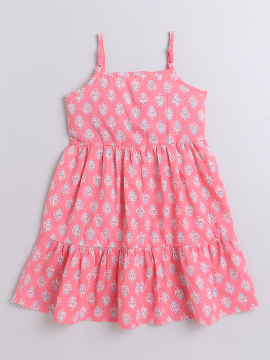 Floral Printed Cotton Sustainable Sleeveless Strappy Tiered Dress- Pink
