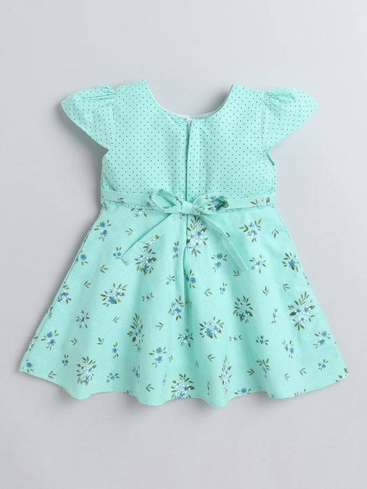 Sustainable Cotton Round Neck Floral Print Sleeveless A-Line Dress- Green