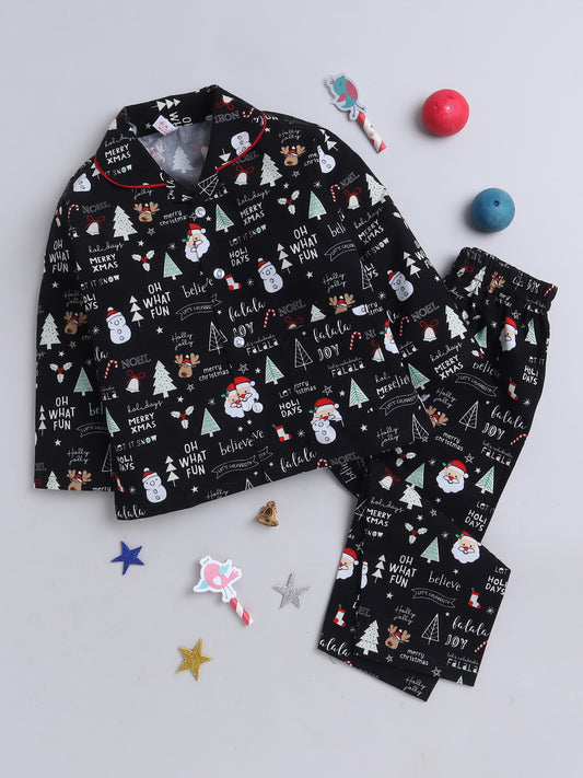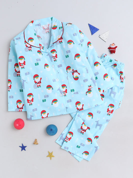 Xmas Santas Printed Full Sleeves Lounge Wear Night Suit Set For Kids Blue