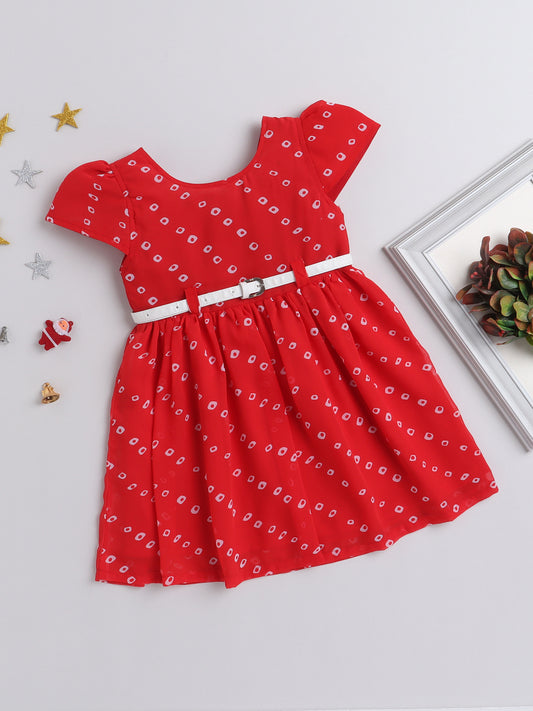 Xmas Square Dots Printed Cap Sleeves Dress With Contrast Belt For Girls-Red