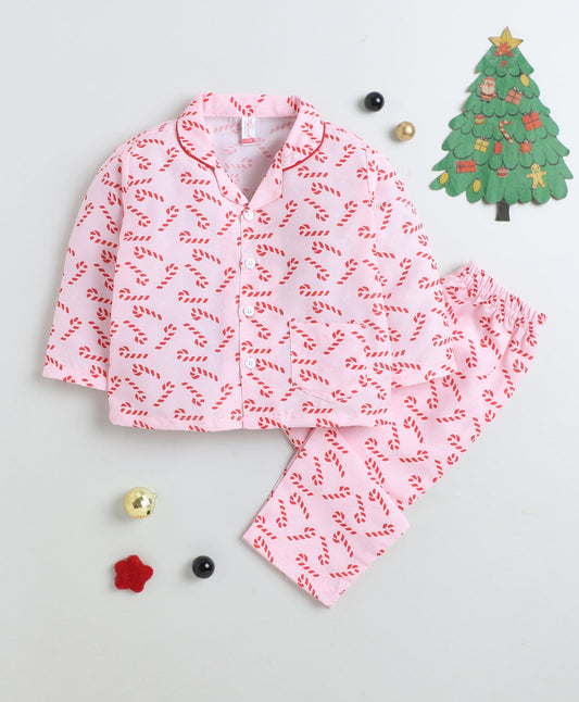 Christmas Theme Woven Full Sleeves Xmas Candy Cane Printed Coordinating Night Suit Set-Pink