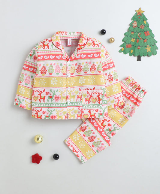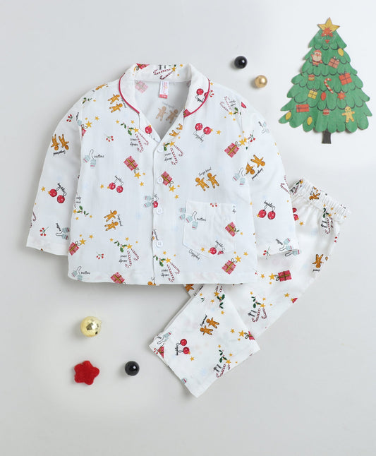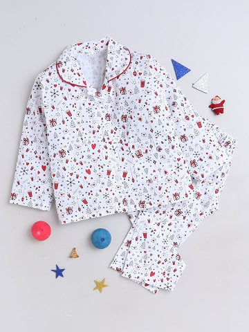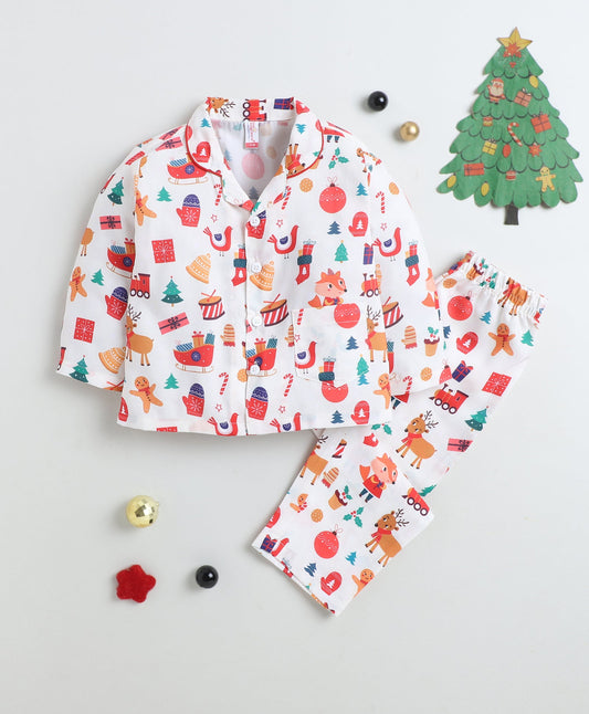 Christmas Theme Woven Full Sleeves Xmas Tree Printed Coordinating Night Suit Set-White