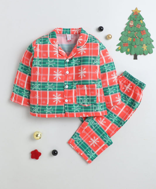 Christmas Theme Woven Full Sleeves Snowflakes Printed Coordinating Night Suit Set-Red