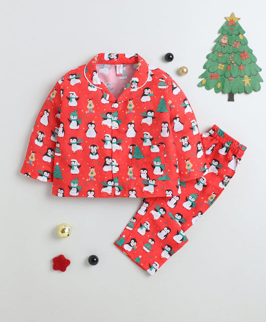 Christmas Theme Woven Full Sleeves Penguin Printed Coordinating Night Suit Set-Red