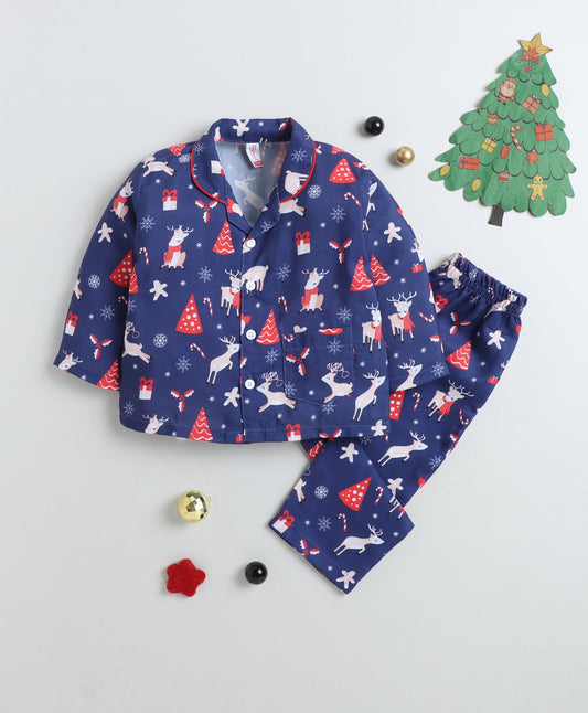Christmas Theme Woven Full Sleeves Xmas Tree Printed Coordinating Night Suit Set-Navy Blue