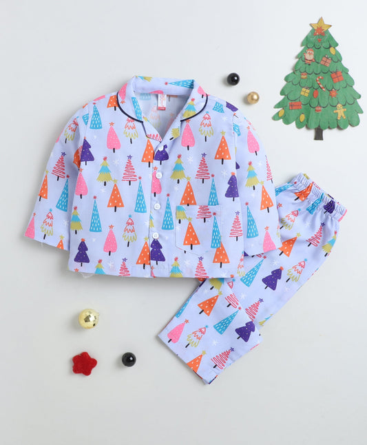 Christmas Theme Woven Full Sleeves Xmas Tree Printed Coordinating Night Suit Set-Blue