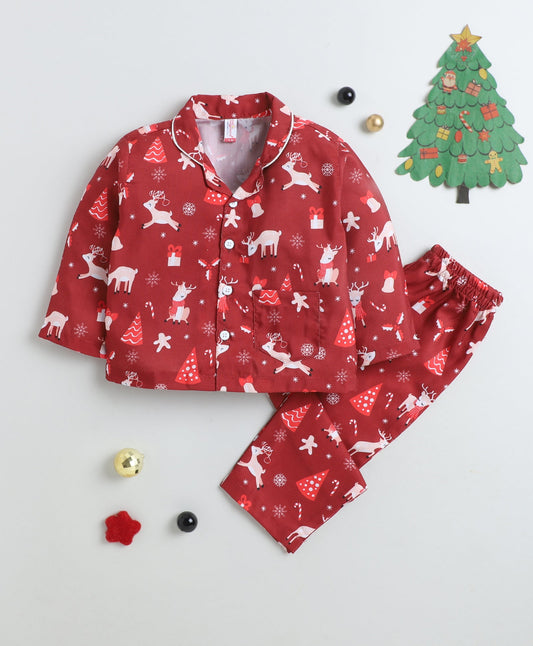 Christmas Theme Woven Full Sleeves Reindeer Printed Coordinating Night Suit Set-Maroon