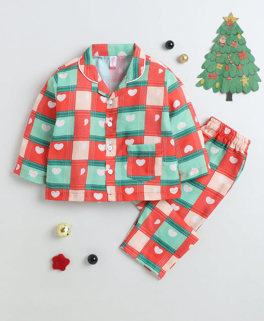 Christmas Theme Woven Full Sleeves Hearts Printed Coordinating Night Suit Set-Red
