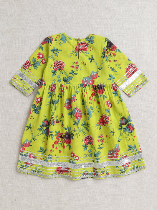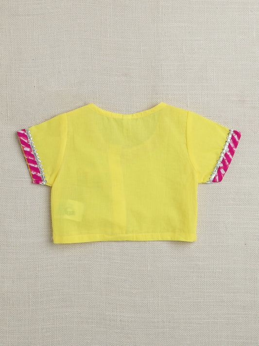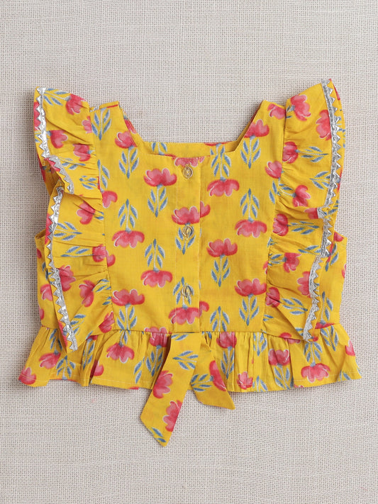 Cotton Half Sleeves Floral Printed & Lace Embellished Lehenga Choli With Dupatta Set - Yellow & Pink