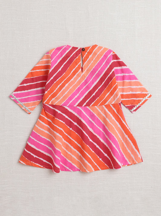 3/4th Sleeves Leheriya Designed & Gota Lace Kurta With Pant -Fuchsia & Orange