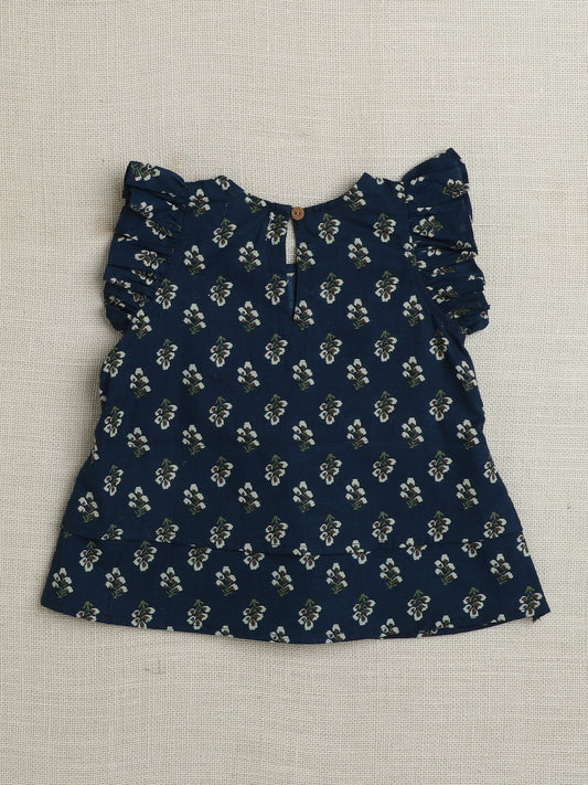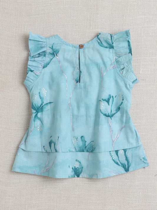 Cotton Frilled Sleeves Floral Printed & Lace Embellished Coordinating Top & Pant Set - Blue