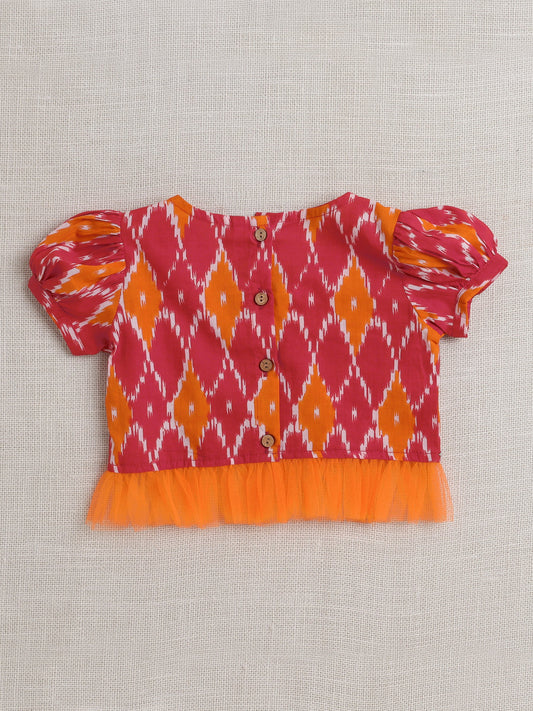 Cotton Half Sleeves Abstract Printed & Lace Embellished Lehenga Choli Set - Fuchsia & Yellow