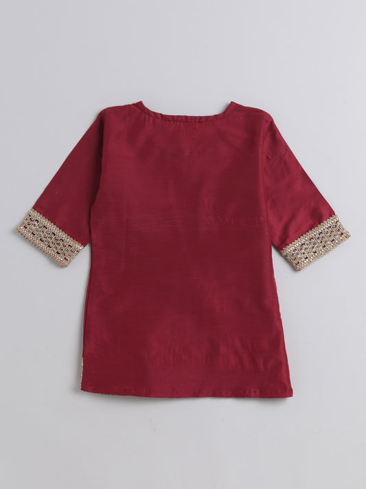 Lace Embelished Short Sleeve Tassled Kurta with Straight Pants For Girls-Maroon