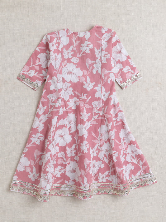Short Sleeves Floral Print Angarakha Kurta and pant Set with Duppata - Pink