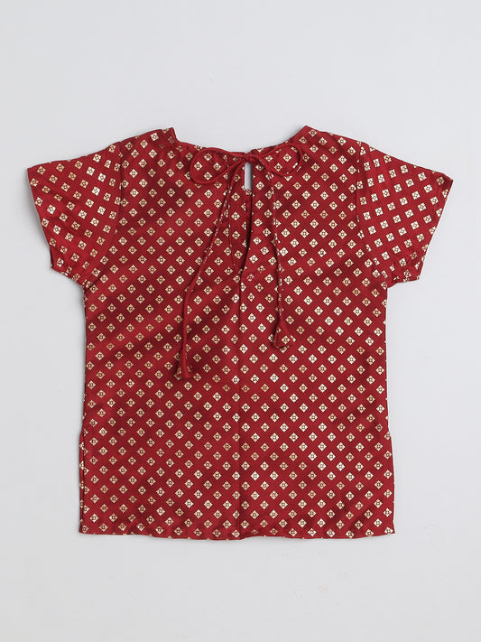 Foil Printed Lace Embellished Short Sleeves Kurti With Floral Sharara and Dupatta Set For Girls-Maroon