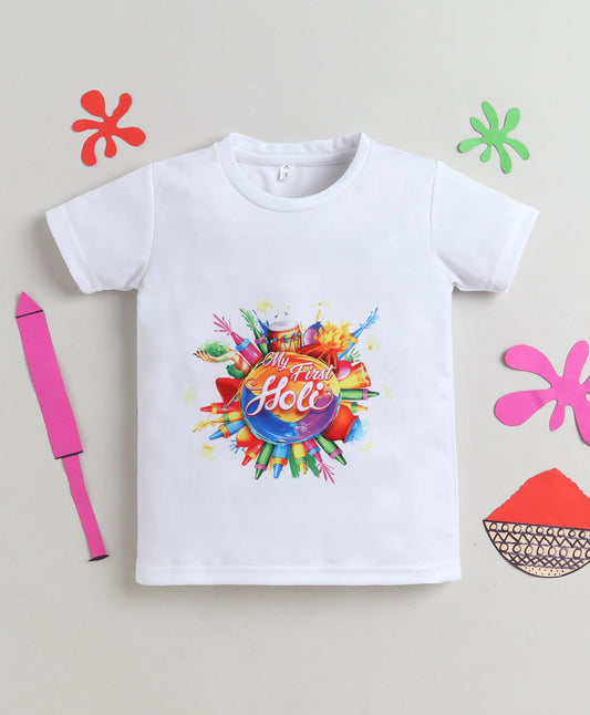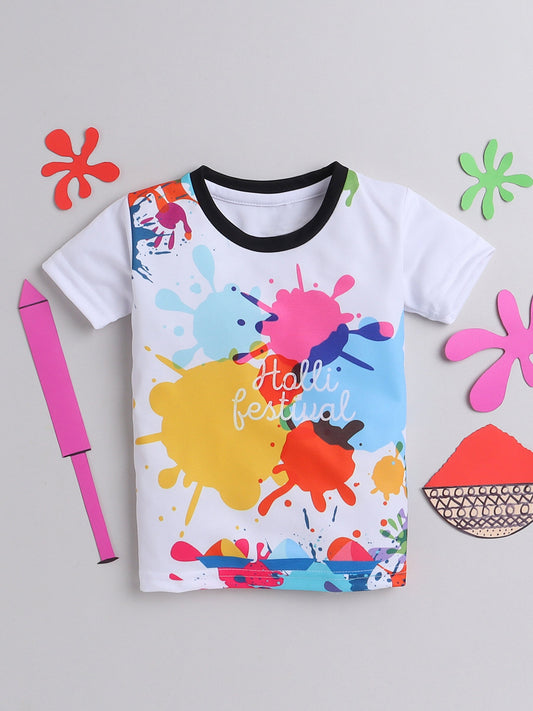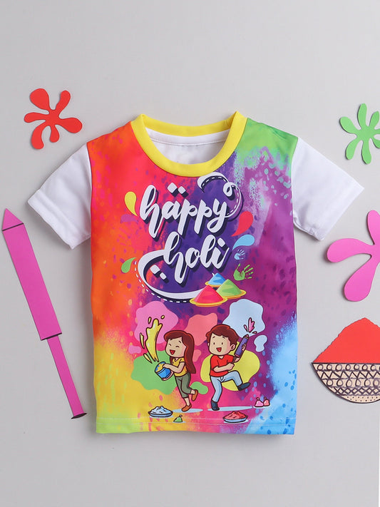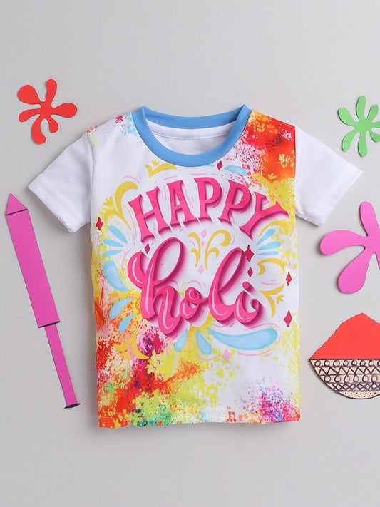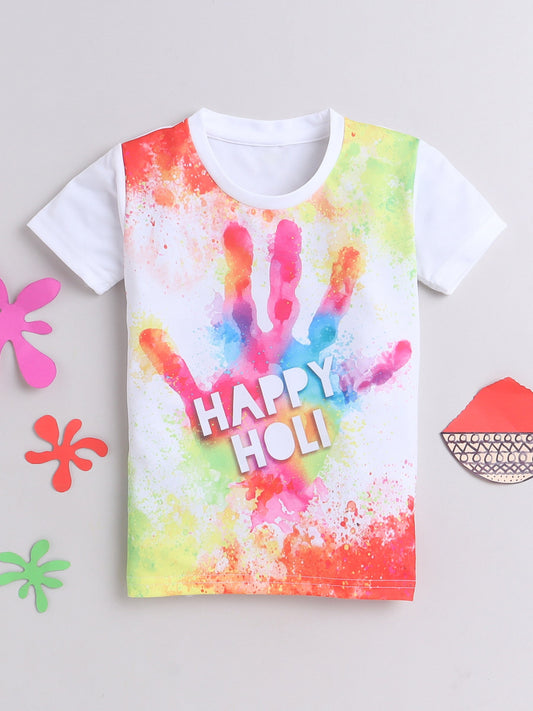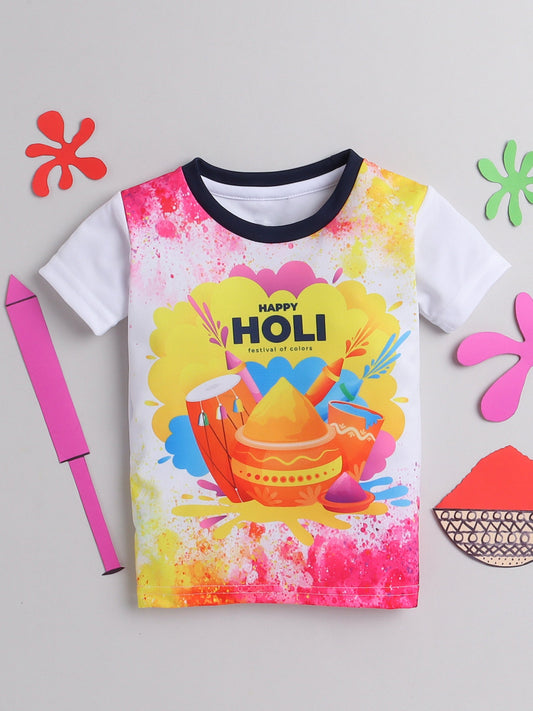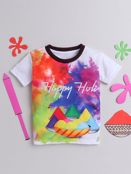The Magic Wand Happy Holi Printed Colourful Holi Special T-shirts For Kids-White