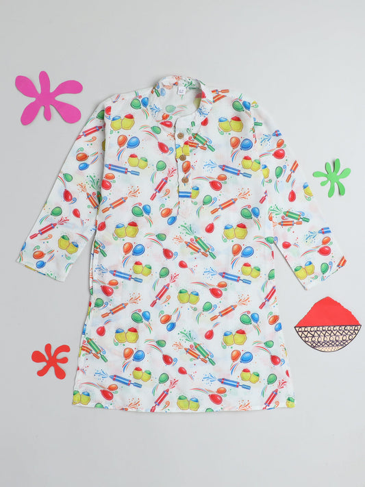 The Magic Wand Holi Full Sleeves Balloon & Pichkari Printed Kurta - White