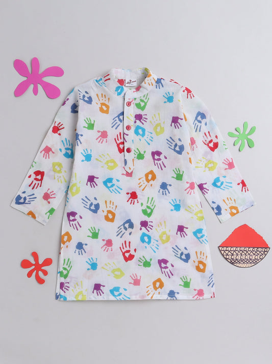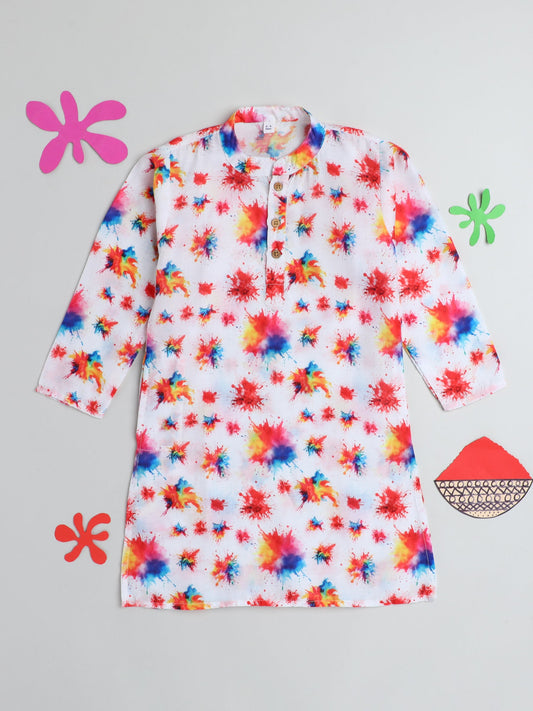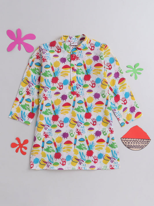 The Magic Wand Holi Festival Theme Printed Colourful Full Sleeves Mandarin Collar Kurta For Boys-White, Multi