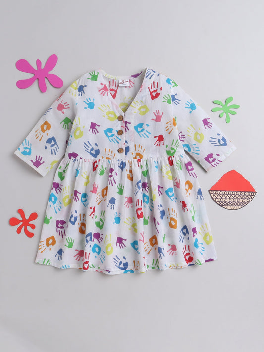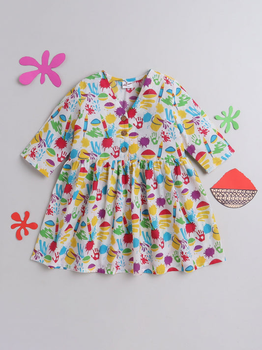 The Magic Wand Holi Festival Theme Printed Colourful Gathered Elbow Sleeves V-Neck Top For Girls-White, Multi