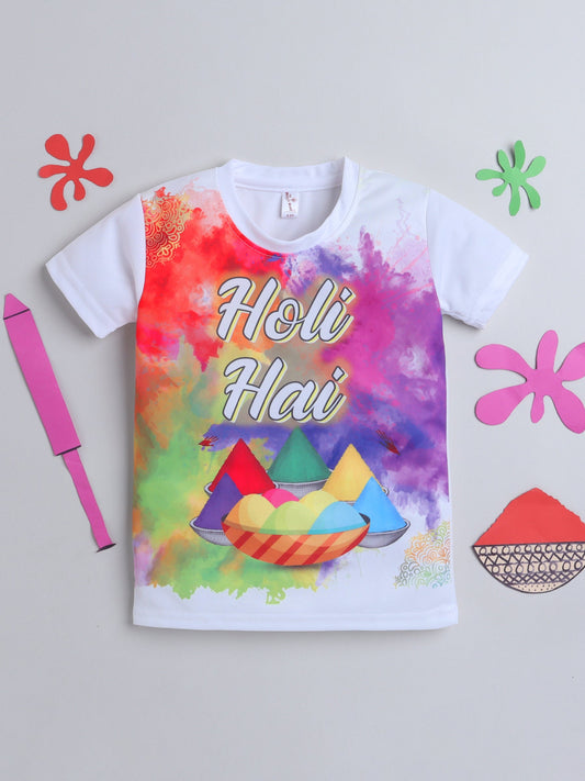 The Magic Wand Holi Hai Printed Colourful Holi Special T-shirts For Kids-White