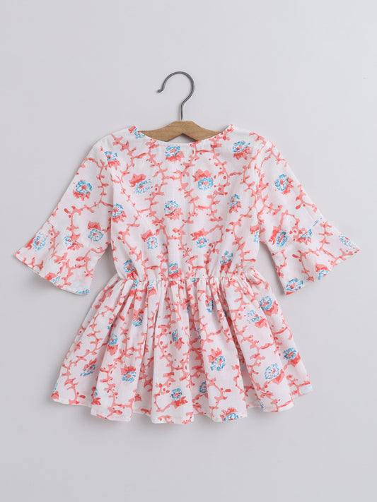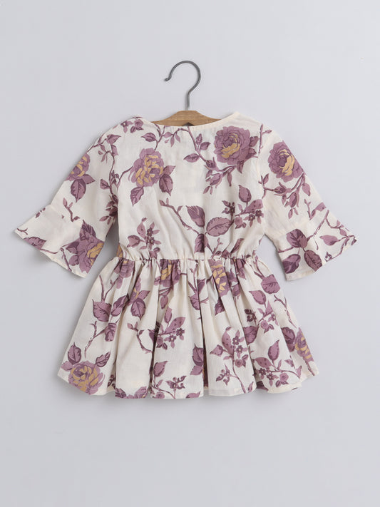 Floral Printed Cotton Gathered 3/4 Sleeves Round Neck Top With Tassels For Girls - Beige