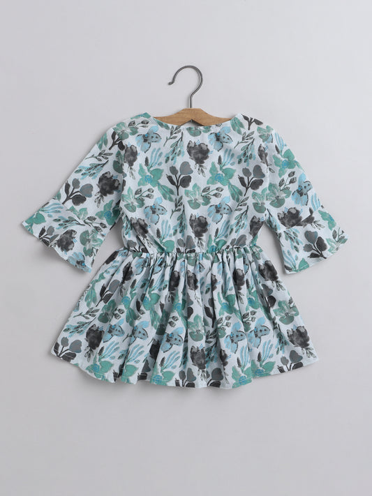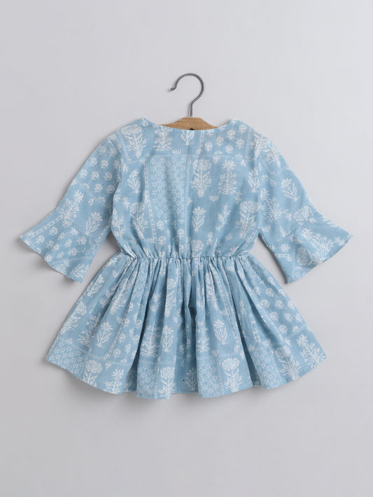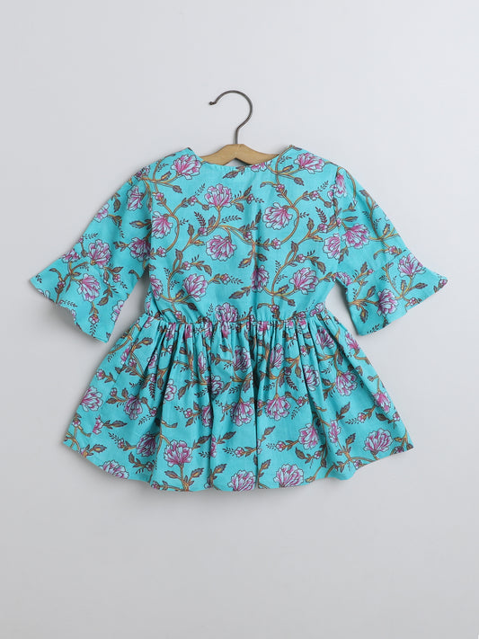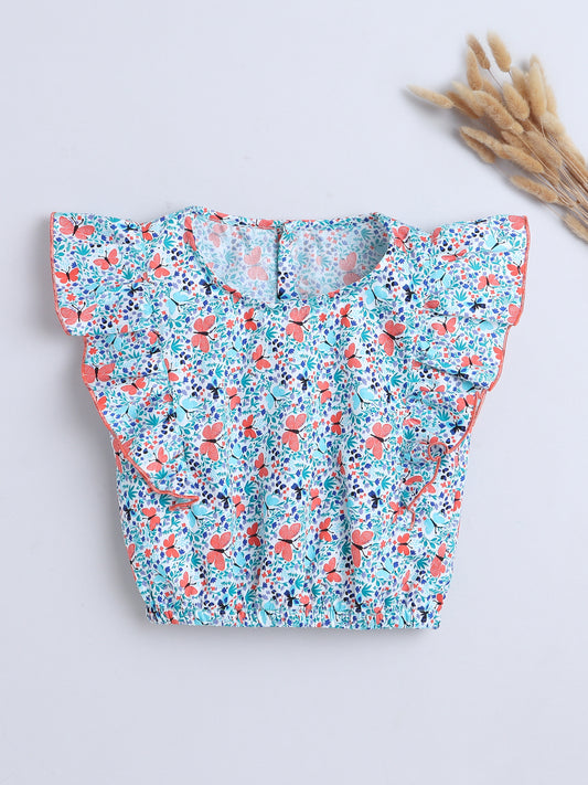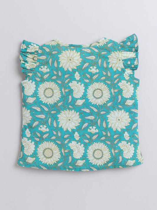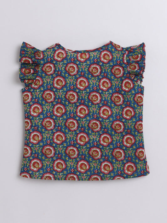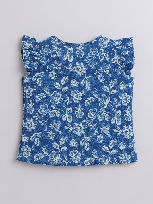 Floral Printed Cotton Sustainable and Comfortable Ruffle Sleeves Top For Girls-Blue