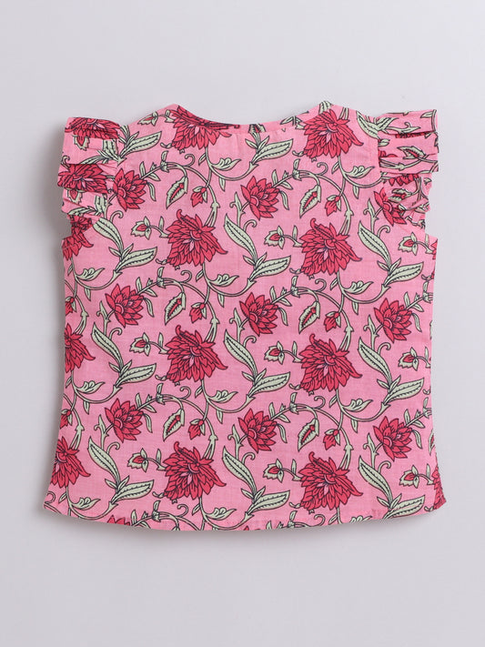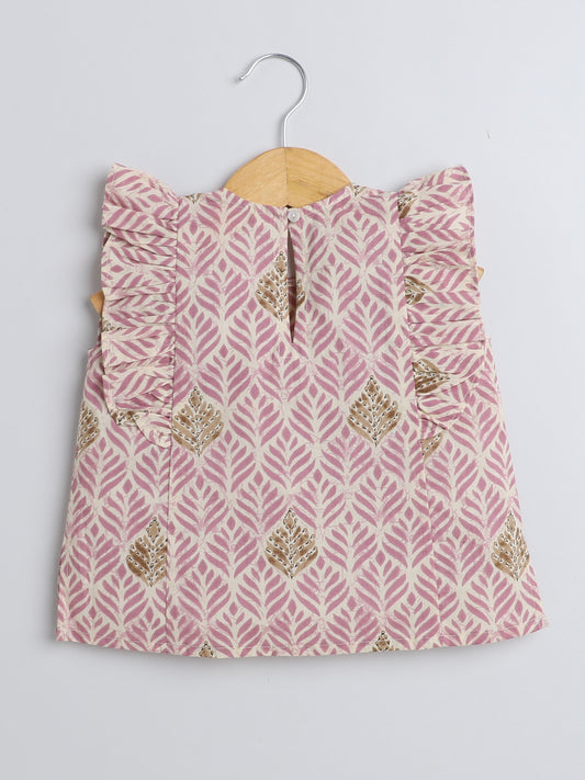 Leaf Printed Cotton Sustainable and Comfortable Ruffle Sleeves Top For Girls- Onion Pink