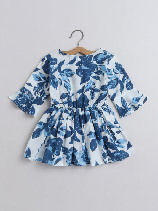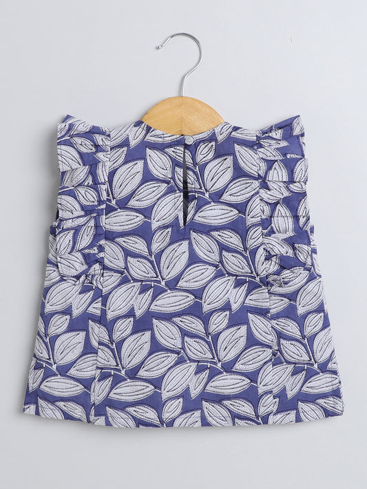 Leaf Printed Cotton Sustainable and Comfortable Ruffle Sleeves Top For Girls-Indigo Blue