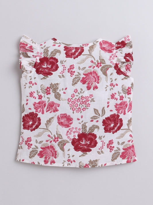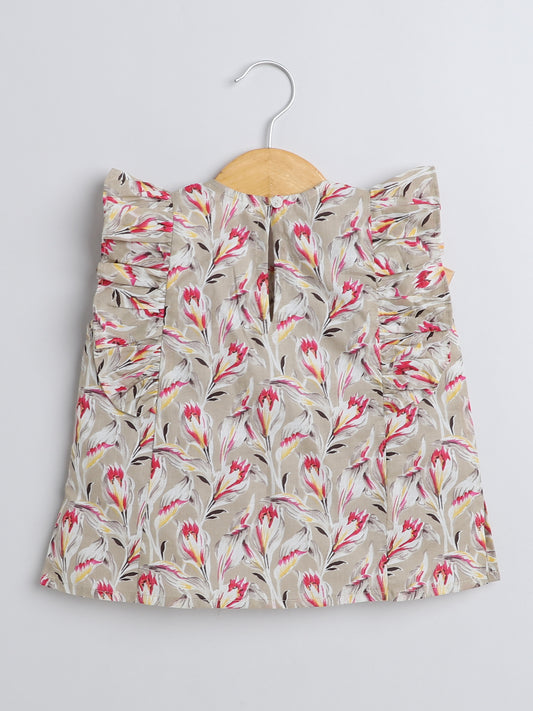 Floral Printed Cotton Sustainable and Comfortable Ruffle Sleeves Top For Girls-Beige