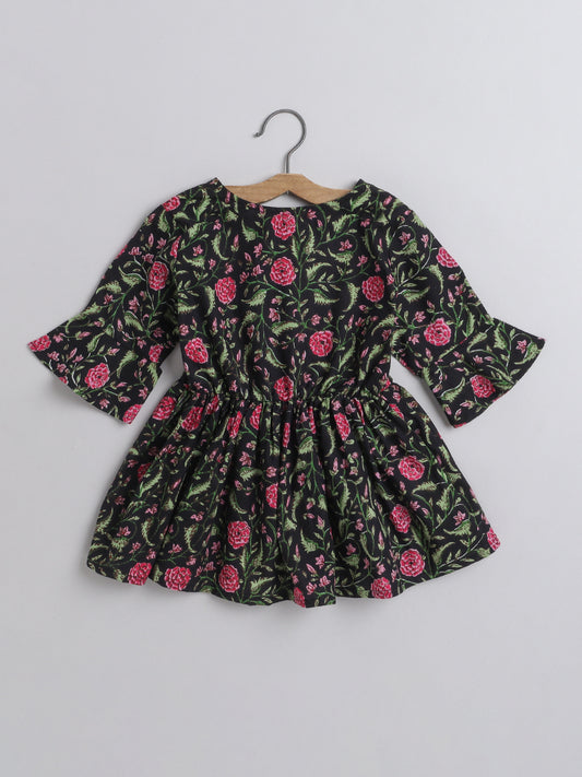 Gathered 3/4 Sleeves Floral Printed Round Neck Top With Tassels For Girls-Black