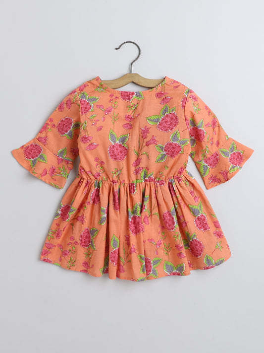 Floral Printed Cotton Three Fouth Sleeves Gathered Round Neck Top With Tassels - Peach