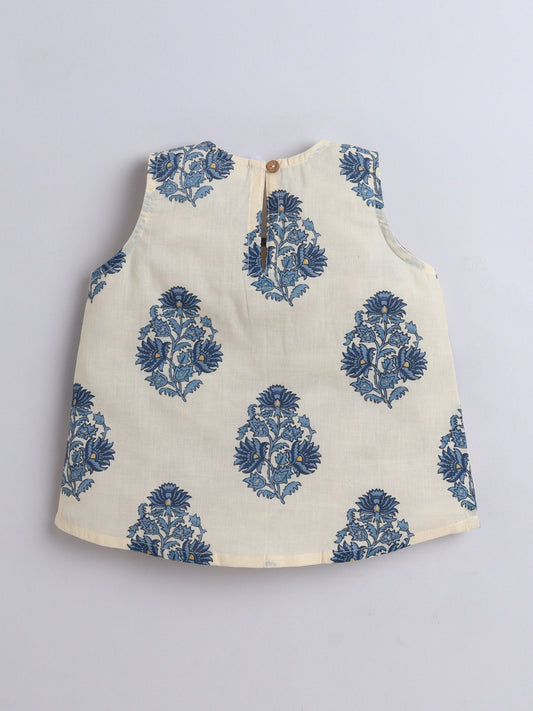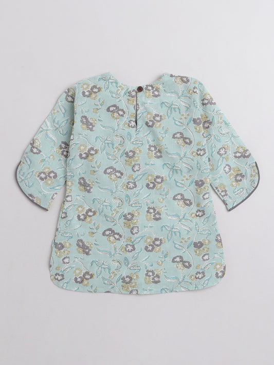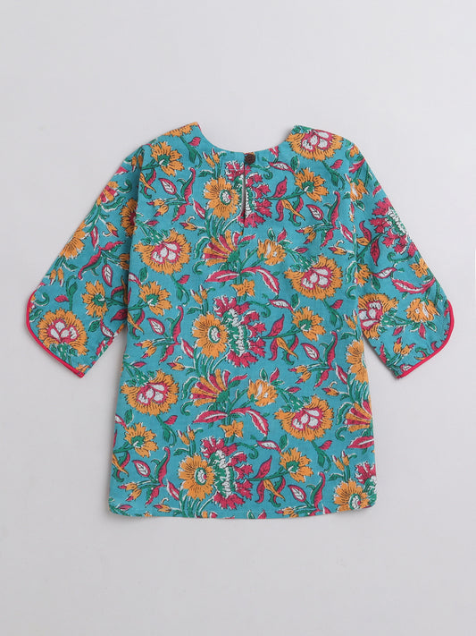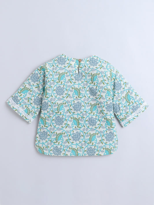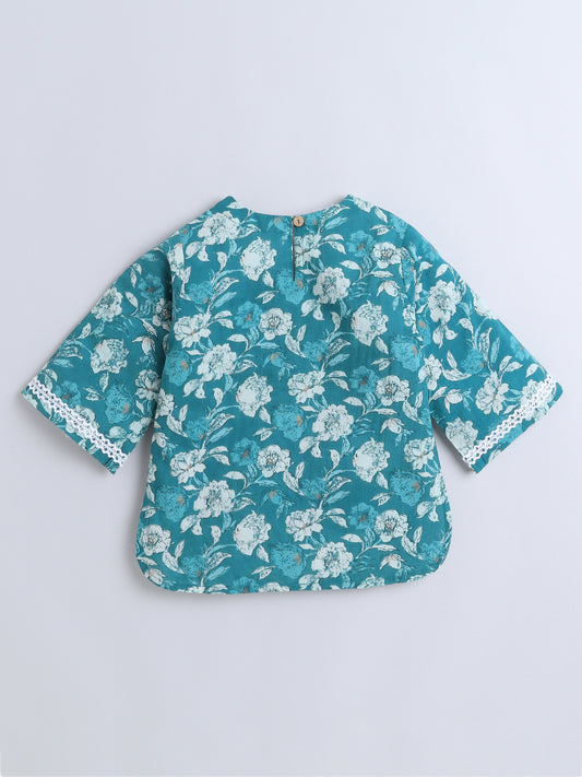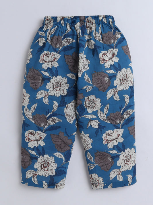 Floral Printed Cotton 3/4th Sleeves Top With Printed Bottom Loungewear Set For Girls- Blue