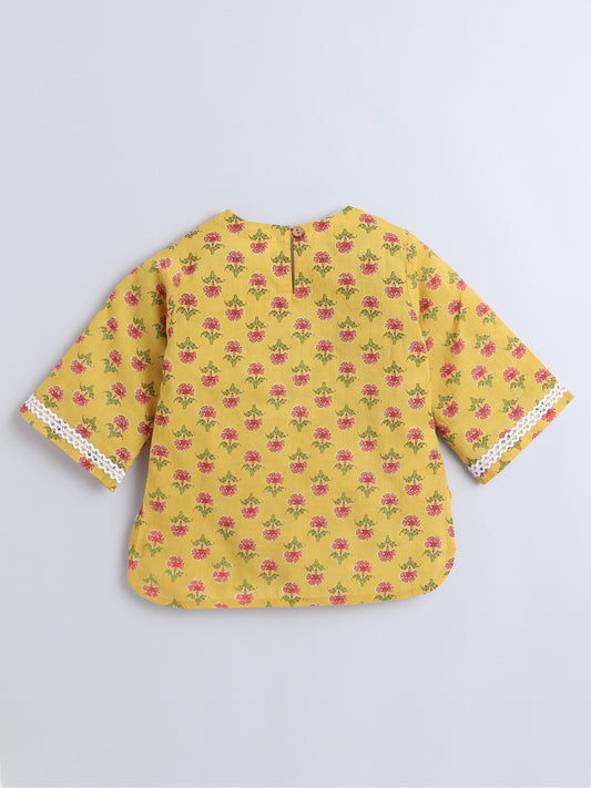 Hand Floral Printed Cotton Lace Embelished 3/4th Sleeves Top and Pant Night Wear Lounge Wear Set For Girls - Yellow