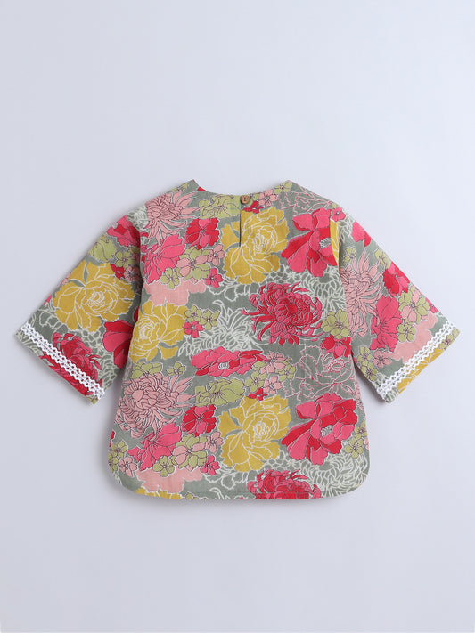 Floral Printed Cotton Lace Embelished 3/4th Sleeves Top and Pant Night Wear Lounge Wear Set For Girls - Grey