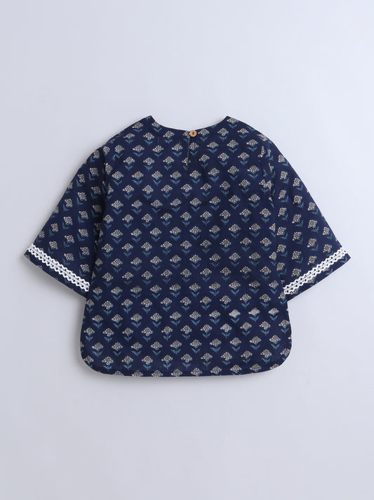 Floral Printed Cotton Lace Embelished 3/4th Sleeves Top and Pant Night Wear Lounge Wear Set For Girls Navy Blue