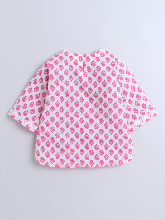 Floral Printed Cotton Lace Embelished 3/4th Sleeves Top and Pant Night Wear Lounge Wear Set For Girls - Pink