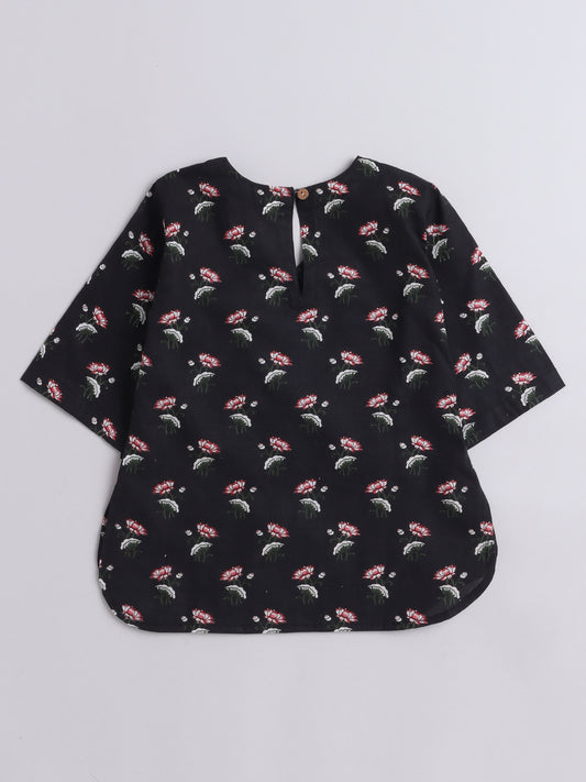 Floral Printed Cotton 3/4th Sleeves Loungewear Set - Black