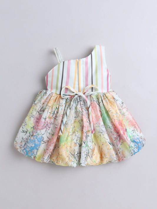 One Shoulder Bow Applique All Over Printed Dress - Multi Color
